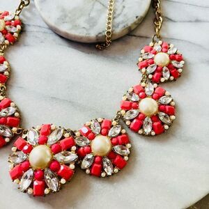 Glam Statement Necklace Coral Red Faux Pearl Round Circle Link Fashion Style
