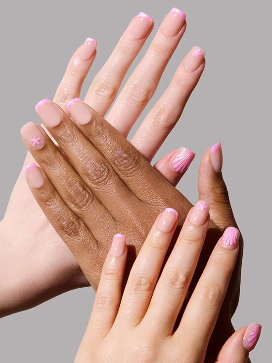 The nude to velvet finish tips with raised gold foil seashells and starfish are set on custom mold. Sanded exudes a warm, sun-drenched shimmer like sand glowing at golden hour.