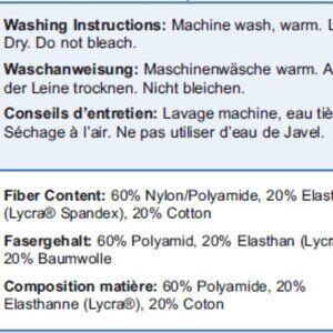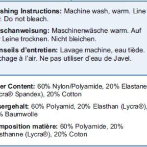 Fabric type: 60% Nylon, 20% Lycra Spandex, 20% Cotton