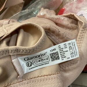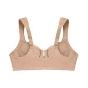 The Glamorise WonderWire Bra offers enhanced comfort with its cushioned underwire and lace-topped cups. It features a convenient front closure and wide, adjustable straps for a secure and personalized fit.