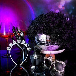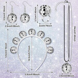 Features: Complete disco attire including a sparkling wig, shimmering jewelry pieces like earrings, necklace, ring, and headband, plus fun reflective sunglasses. All pieces are designed with shiny, glittery disco balls and retro charm, making you the star of any party. The set is lightweight and comfortable, crafted from durable materials like synthetic fiber, glass mirror surfaces, and resin rhinestones—built to last through any dance night.