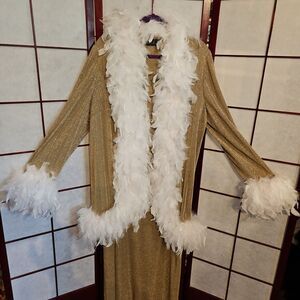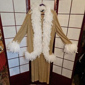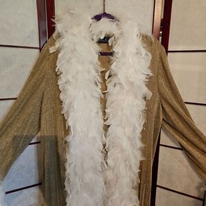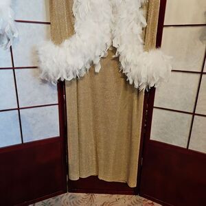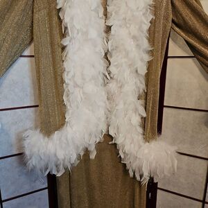Open-faced sparkling gold with white feather boa along open frontside, around bottom hemline, and around sleeve cuffs
