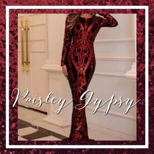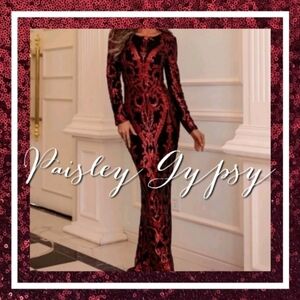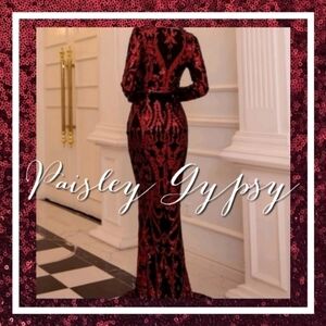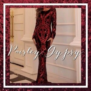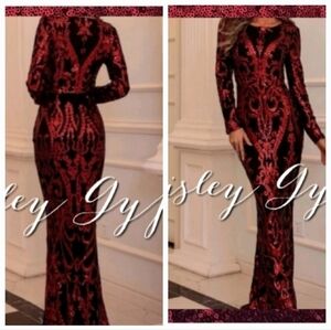 Capture the light and all the attention in this stunning burgundy gown! The luxurious sequins contrast beautifully with the sleek long-sleeve silhouette and provide an unforgettable glamour that's perfect for any formal occasion.