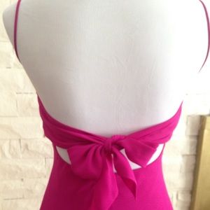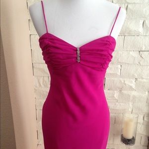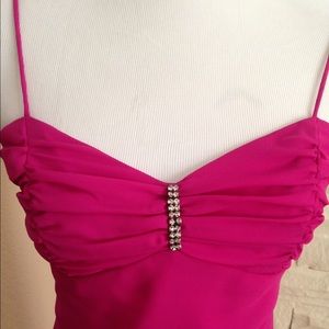 This fuchsia pink dress is so gorgeous! A touch of cuteness that ties as a bow in the back. Zips at the bottom half. Rhinestones in front adds a glamorous flair. Size on tag is 5/6. 100% polyester. Worn once. ๐