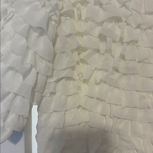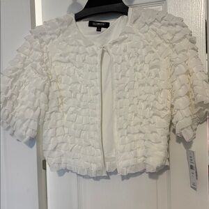 Chic ivory jacket with ruffled texture. Short sleeves for a stylish look. 2 both in size Large. Pit to pit measures approximately 18". Length is approximately 17" from the top of sholdier