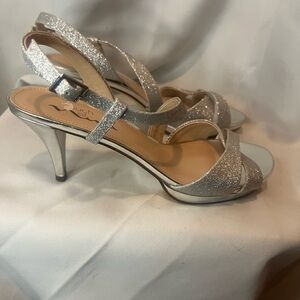 These silver heels feature a sleek stiletto style and intricate strappy details, perfect for adding a touch of glamour to any formal occasion. The ankle strap with buckle closure ensures a secure fit, while the metallic finish offers a sophisticated shimmer.
