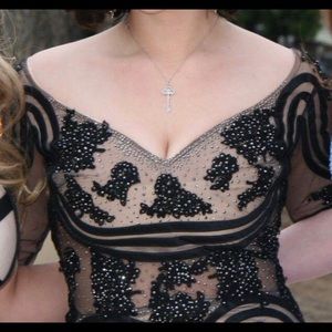 Beautiful sheer mesh lace low back prom dress. The bodice and sleeves are sheer with black sewn on floral decor. This dress is so flattering and sexy! Very old Hollywood glam vibes. I got soooo many compliments at my prom when I wore it In perfect condition because it was worn only for one night!!!