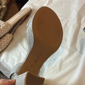 These stunning silver heels boast a strappy design and a medium-height heel, perfect for making a statement at any formal event. The glittery finish adds a touch of sparkle, while the adjustable ankle strap ensures a secure fit. Ideal for special occasions, these heels combine elegance and comfort effortlessly.