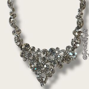 This stunning necklace exudes elegance and sophistication. Crafted from silvertone metal, it is adorned with an array of sparkling glass or rhinestone embellishments.