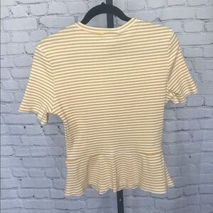 Pretty mustard yellow and white stripes, peplum hem and sleeved scoop neck.