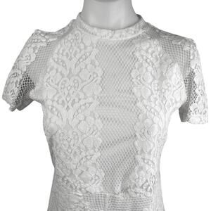 Glamorous White Lace Mock Neck Short Sleeve Sheer Mini A-Line Dress Size M
