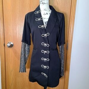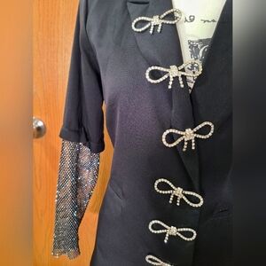 Glamorous black blazer with rhinestone netting sleeves and bow accent collar