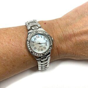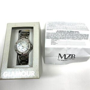 Beautiful and elegant Glamour brand bracelet style watch with stainless steel band, mother of pearl watch face and crystal embellishments surrounding the watch face. Quartz movement Japan. Band is approx 7.5" in length when open. Comes like new with original box and paperwork. Box has some shelf wear. Watch is in full working order with brand new battery (377/S626). Looks so luxe and elegant on the wrist.