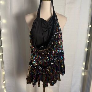 This halter costume features a dazzling array of black and blue sequins, creating a shimmering effect perfect for festive occasions. The halter neckline adds a touch of elegance, while the relaxed fit ensures comfort and style.