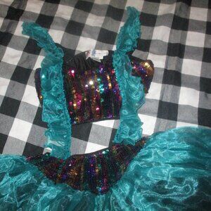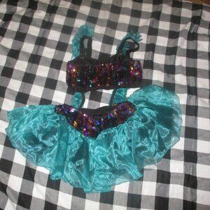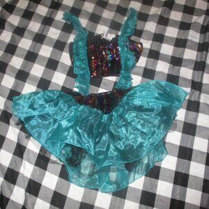 This is a 1 piece costume. Aqua color sheer overskirt. Seriously to die for!!! I cannot promise every sequin is still attached but still looks beautiful. You will LOVE this. So much more beautiful in real. Smoke free home