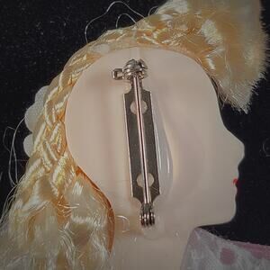 Resin lady face brooch measurements in pictures. Adorned with delicate lace and a pink ribbon. This brooch features intricate facial details and a blonde hair design, perfect for collectors or as a unique fashion accessory.