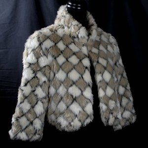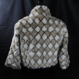 Need a chic ultra-glam accessory to dress up an outfit for an event or date? Or do you want to glam up a casual street style look? Try this faux fur checkerboard print fashion coat. This is a really beautiful, elegant piece you can wear with anything. The colors are neutral in beige, white, and black trim faux fur. The collar is a pop-up style. The interior is a sateen tan. Size Large Juniors. Condition is Excellent in good condition.