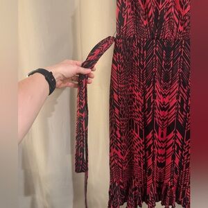Step out in style with this elegant red and black patterned dress. Perfect for any occasion, this dress combines comfort with a chic design. A must-have addition to your wardrobe.