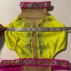 Glamour solo dance costume hot pink neon yellow Feather rhinestone bedazzled LC