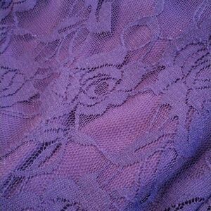 Soft knit dress in a rich purple. Wrap front. Lace wrap top. Flippy skirt with gussets at the bottom for added flirt.Lots of movement when you walk. Size 6 measures 36 at chest, 30 under chest, 42 at hips, 40 long from shoulder to hem. Dramatic, but still fun. This dress wants to go dancing.