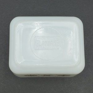 Glasbake White Milk Glass Gold Snowflakes Refrigerator Dish. Sorry, no lid. 5" x 4" x 2.25" tall, 1 pint. Very good vintage condition. The gold graphics show some wear but are intact for the most part and there are a few rough patches on the inside top rim. Overall, a very nice piece for use or display.