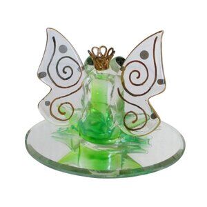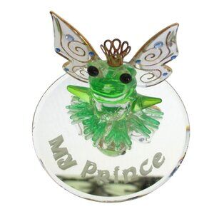This vintage Glass Baron glass figurine features a whimsical green frog with a gold crown and intricate swirl wings with blue crystal accents, attached to a My Prince mirrored base.