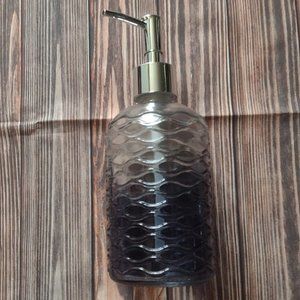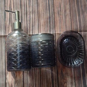 NEW -NEVER USED Smoky Blue-gray glass accessories, Include soap dispenser pump, toothbrush holder, and soap dish. From SMOKE-FREE - PET-FREE Home.