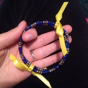 Blue and silver glass beads. Wraps around three times on a wire base. Decorated with yellow bows to hold neatly together