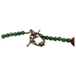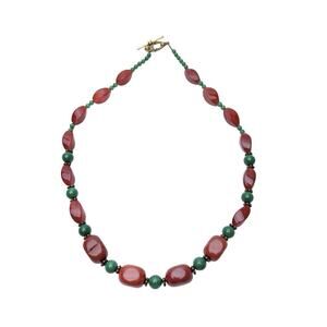 I believe the green beads are glass and the larger opaque stones at the bottom of the necklace are quartz. The oval shaped stones are translucent and look like carnelian but I cannot confirm the name of that stone.