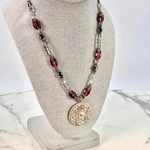 Unique Etched Clear and Deep Red Glass Bead Medallion Necklace