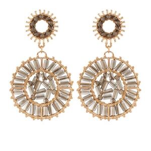 These earrings feature a round drop design crafted with glass beads, offering a colorful and textured statement.