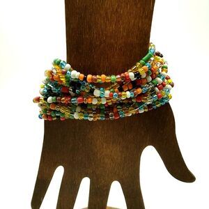 Glass Beaded Stretch Bracelet 14 Strand Wood Buckle Multi-colored