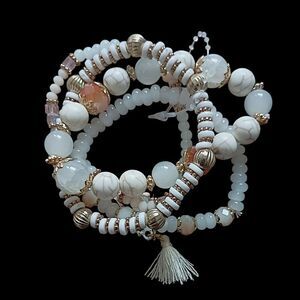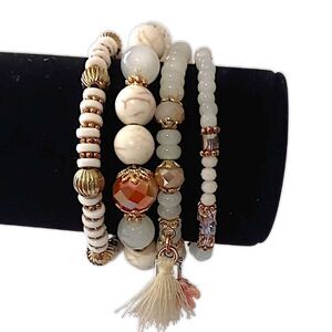Glass Beaded Stacked Bracelet Rows Beads Floral Neutrals Y2K Boho Fairy Indie. Condition is new and never worn. Still has plastic loop keeping them together. Glass beads. Stretch in great condition. Unbranded. Please see all photos for detailed condition.