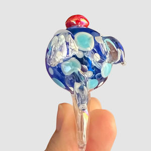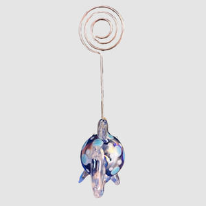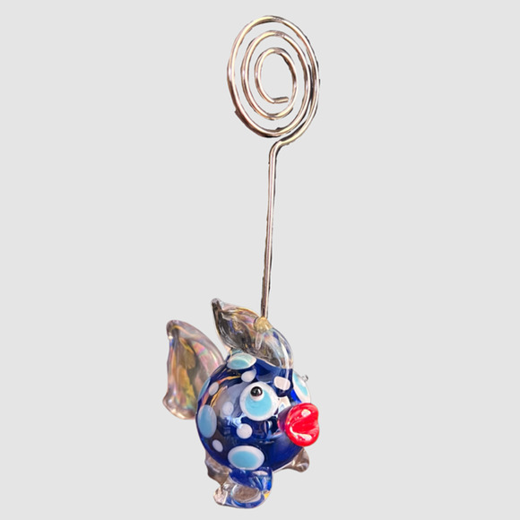 Blue glass blowfish note holder. This adorable memo/note holder can be used to hold pics, notes, cards, etc. It is super cute, with vibrant colors and is great for a desk or shelf.