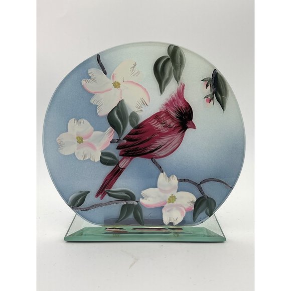 Glass Candle Holder Painted Cardinal Mirrored Apple Blossoms Tea Light