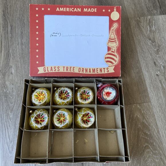 Glass Christmas Ornaments Lot 7 | Box + 6 Yellow & 1 Red Vintage