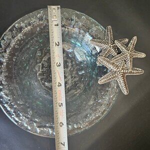 A sweet vintage clear textured bubble art glass small accent bowl adorned with three textured silver tone starfish that have raised shiny silver design and antiqued. This cute bowl will add a beachy nautical vibe to your living space. Free of any defects. Top of the bowl is smooth and glossy glass. Bottom is textured surface. The starfish look like expensive jewelry on this bowl. Very pretty. Bowl measure 6 1/2 inches in diameter. And 1 7/8 inches tall. Starfish measures 3 5/8 inches wide. 2 1/2 inches high. Condition is excellent pre-owned. Non smoking pet free home.