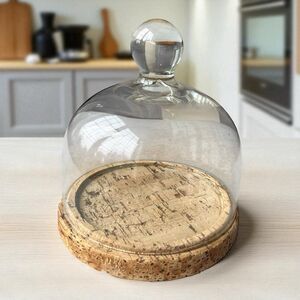 Beautiful clear glass cloche dome with a sturdy cork base. Perfect for displaying candles, small plants, collectibles, or as a stylish kitchen accent. The dome features a rounded handle for easy lifting.