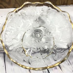 Vintage Glass Etched Pedestal Compote Bon Bon Floral Dish Gold Trim.