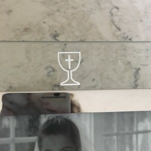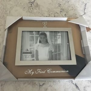 Clear glass with silver picture border with silver writing “ My First Communion”