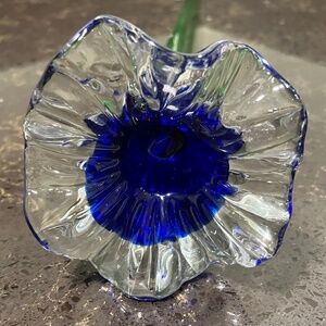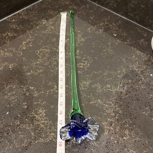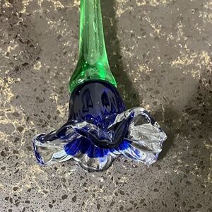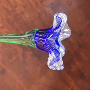 Hand-sculpted from solid glass, this blue and clear hues with a green stem, showcasing intricate craftsmanship. The glossy finish and long stem add to its beauty, making it a perfect addition to any decor.