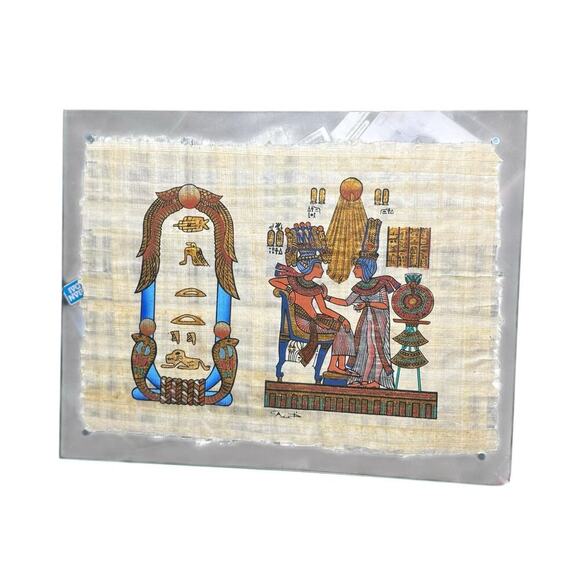 A superb original hand-signed painting on papyrus with matte and metallic paints. This painting depicts the throne of Tutankhamun, Queen Ankhesenamun holds a salve cup and spreads perfumed oil on her husband's collar in a typical Amarna style scene. The sun disc Aten shines above the royal couple. Papyrus is a material similar to thick paper that was used in ancient times as a writing surface. It was made from the pith of the papyrus plant.