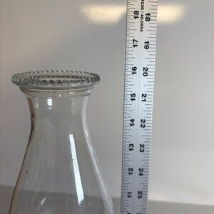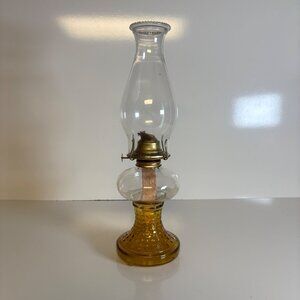 This vintage glass hurricane oil lamp offers functional charm, featuring an amber base and clear chimney. Ideal for ambient lighting or decor accents.