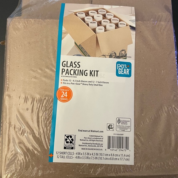 glass packing kit in brown/tan. Provides protective cells to safely pack up to 24 glasses. Durable brown kraft material with individual foam/plastic-lined cells. Ideal for organized, secure storage and moving. Includes both short and tall cell inserts for versatile use.