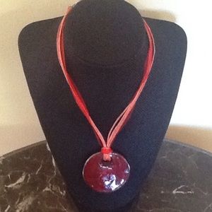 Funky glass pendant on red and orange ribbon with lobster clasp.