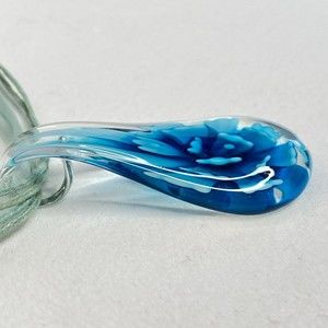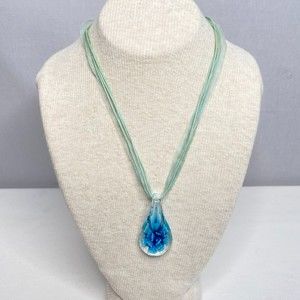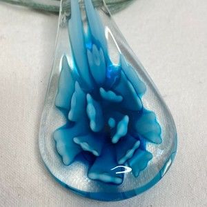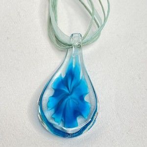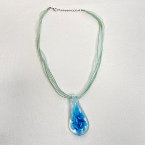 Glass Pendant Ribbon Necklace Blue Flower Inlay