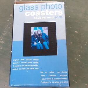 Set of new in box Glass Photo Coasters Set of 4 with Solid Wood Holder. Dress up any desk, counter top, or table setting with this beautiful photo coaster set. Designed to display your favorite photos. Each coaster features high quality beveled glass and soft non-skid pads. Each coaster displays 2" X 3" photographs beneath glass. These attractive coasters protect your valuable furniture from hot cups, spills, drink condensation and more. Includes 4 glass coasters and a wooden centerpiece holder. Would make an excellent wedding or graduation gift to display special moments, or even for that new baby or grandchildren, or children.