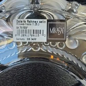 Mikasa Princess 11 1/4 inch picture frame is a vintage, heavy clear and frosted glass frame, typically made in Germany, designed for tabletop display. It commonly features a romantic or ornate border, making it ideal for wedding photos, usually accommodating a 5x7 inch picture. Rear-loading with velvet backing.