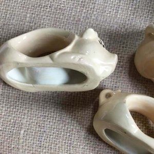 Seven glass piggy napkin rings. These cute pigs have no markings or names on them. They are 3 1/8" long and 1 1/2" at the widest part.