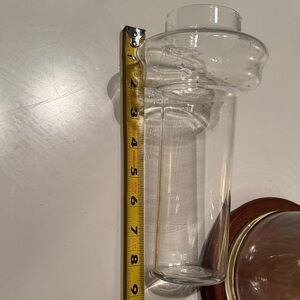 Elegant glass pitcher with a sturdy wooden base, perfect for serving beverages in style. The clear design complements any kitchen decor.